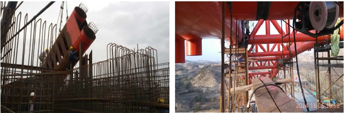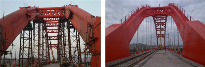 結(jié)構(gòu)設(shè)計(jì)為剛性系剛性拱,為正做斜制。跨度128m。設(shè)兩道拱肋,拱肋采用外徑φ1300mm,壁厚t=26mm的鋼管混凝土啞鈴型截面,上下弦管中心距2.2m,拱肋截面高3.5m,拱肋上下弦管之間連接綴板t=26mm,綴板間距700mm,綴板間除拱腳面以外5m范圍及吊桿縱向1.5m范圍灌注混凝土外其余均不灌注混凝土。