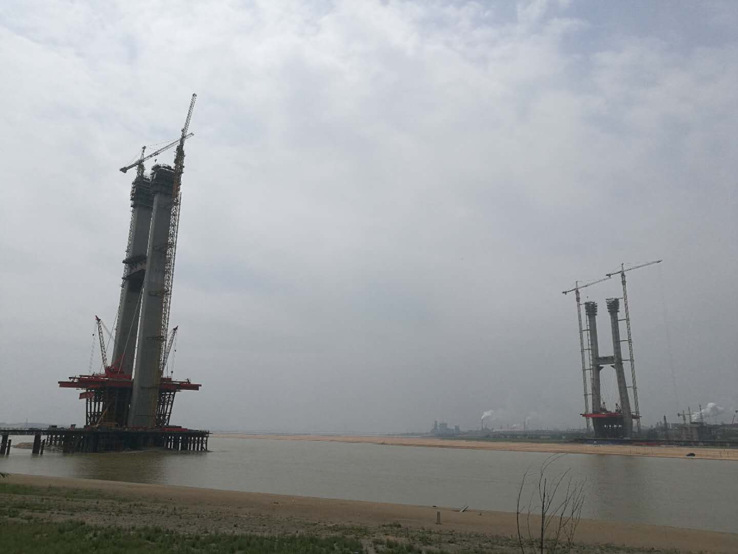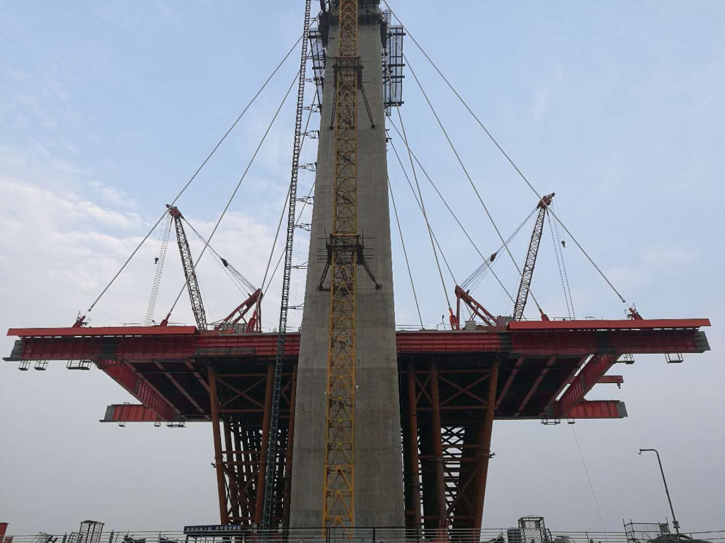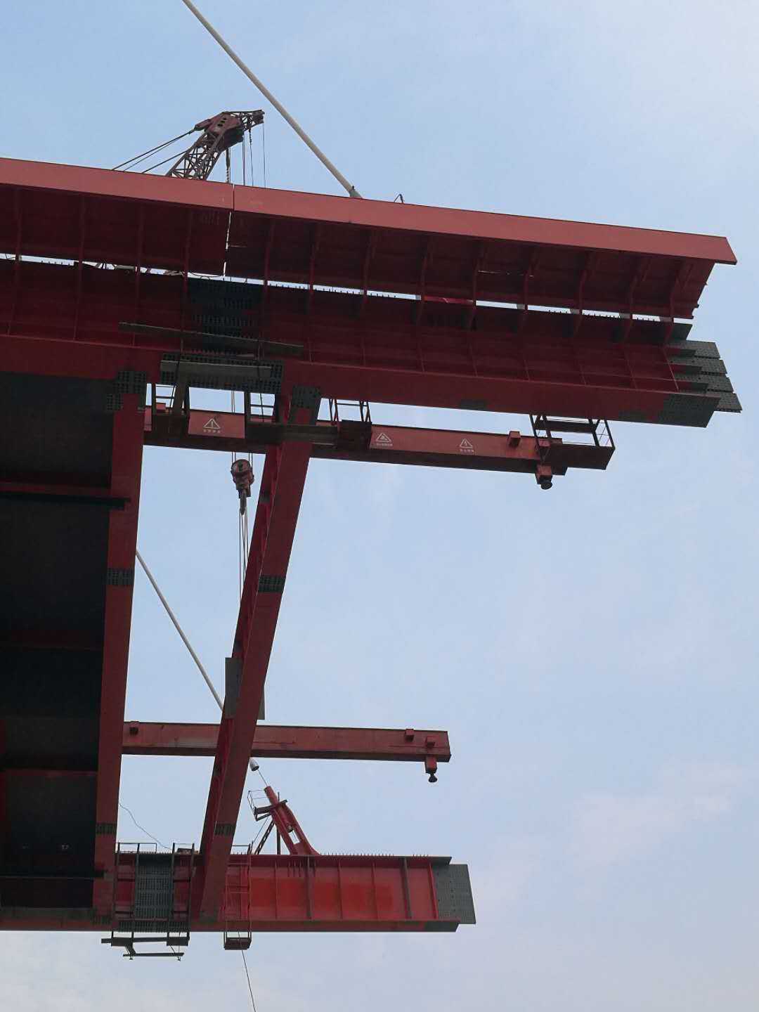 陜西側(cè)正在吊裝Z3、B3標(biāo)準(zhǔn)節(jié)段鋼梁,山西側(cè)正在吊裝Z2、B2節(jié)段的鋼梁。檢查車、提梁站及運(yùn)梁平車的安裝前準(zhǔn)備工作已完畢。