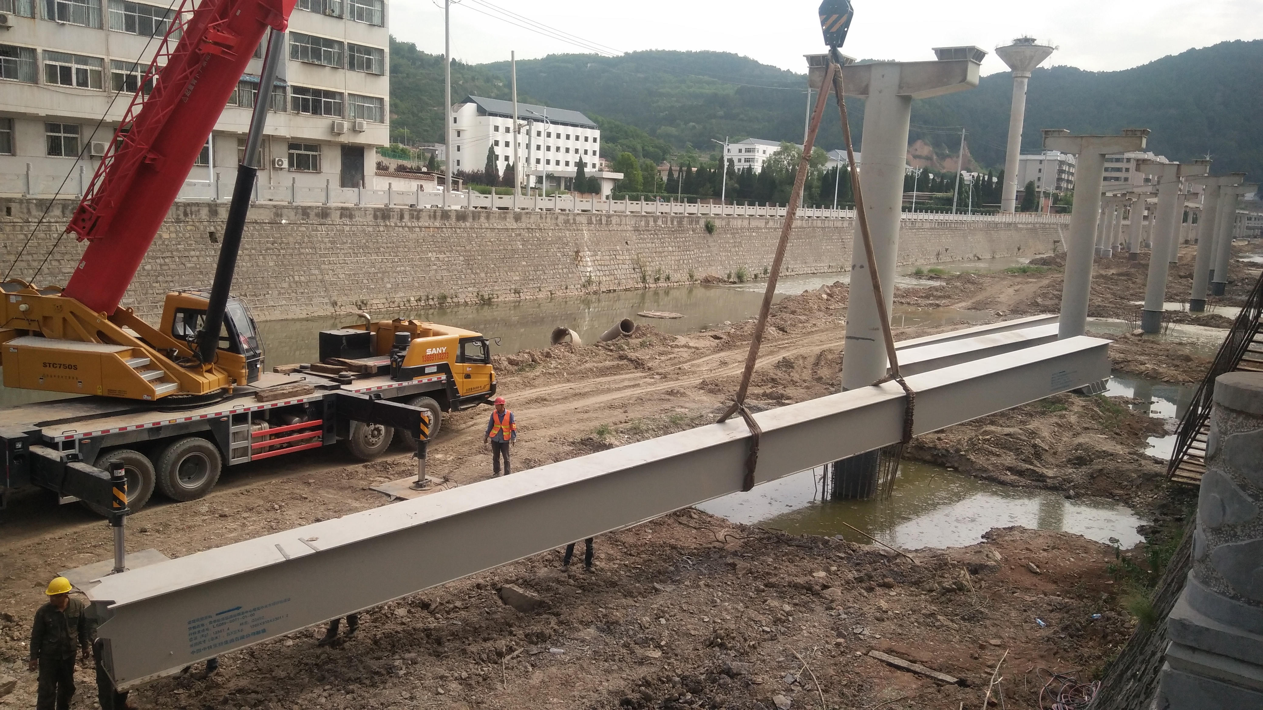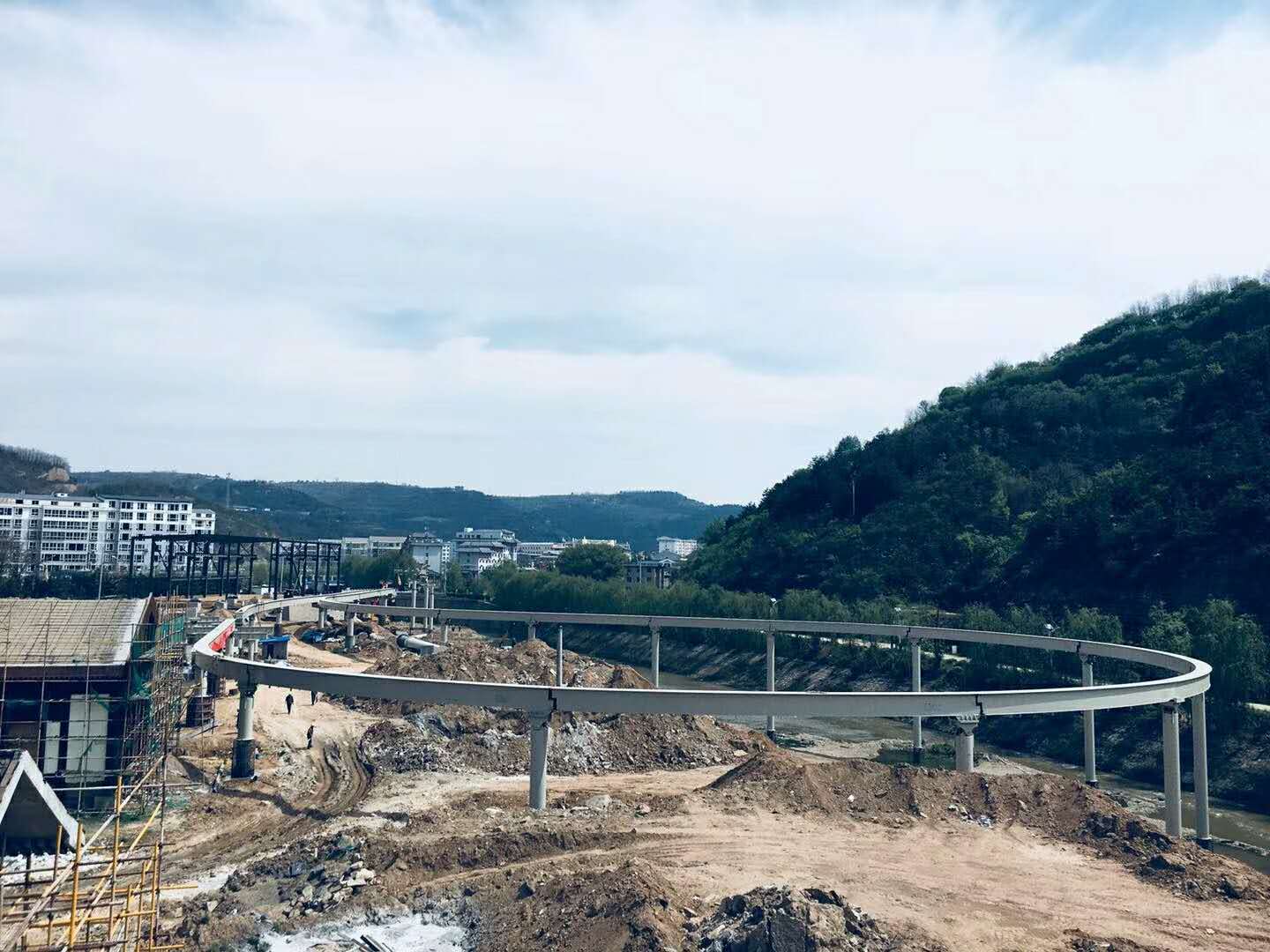 黃帝陵景區(qū)游客服務(wù)中心觀光小火車項目線路沿沮河河道中走行,采用觀光單軌制式,線路起始于黃帝陵游客服務(wù)中心,終點為黃帝陵站,位于目前的集貿(mào)市場位置。 現(xiàn)在以完成我標(biāo)段1-77號立柱與鋼梁的安裝