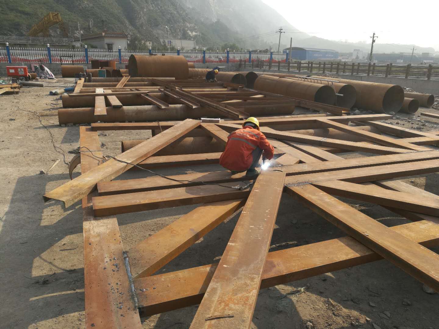 山西側(cè)邊跨10號(hào)墩支架拼焊槽鋼網(wǎng)片,11號(hào)主塔第四節(jié)段主梁安裝完畢