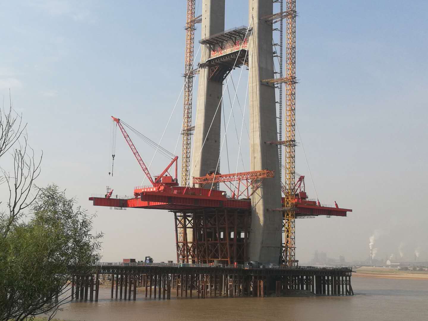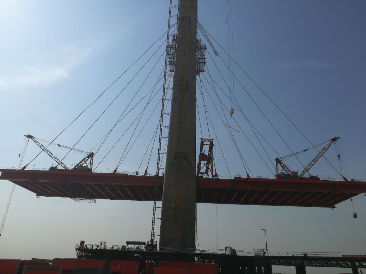 陜西側(cè)12號(hào)主塔已完成第五節(jié)段的安裝,正在拼裝六七節(jié)段的橫梁,提升站安裝完畢