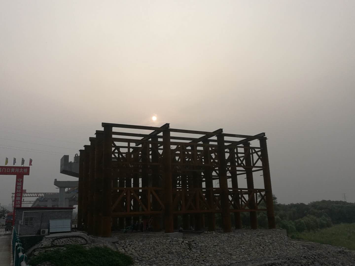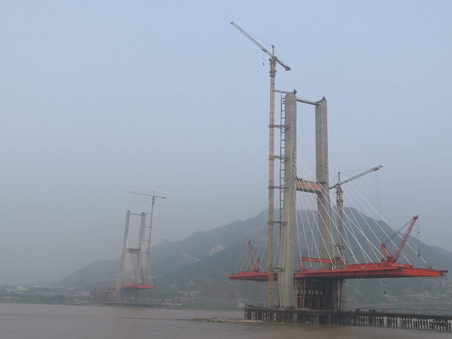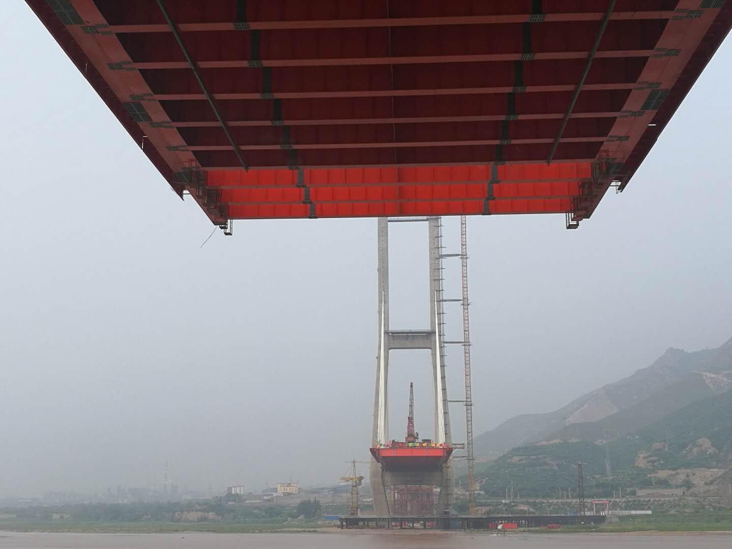 陜西側(cè),12號(hào)主塔完成第9節(jié)段鋼梁安裝,第8、9節(jié)段做濕接縫,目前進(jìn)行第10、11節(jié)段主梁倒運(yùn),橫梁拼裝。13號(hào)墩邊跨支架已完成吊裝工作,正在焊接 槽鋼及上部縱橫梁結(jié)構(gòu)。