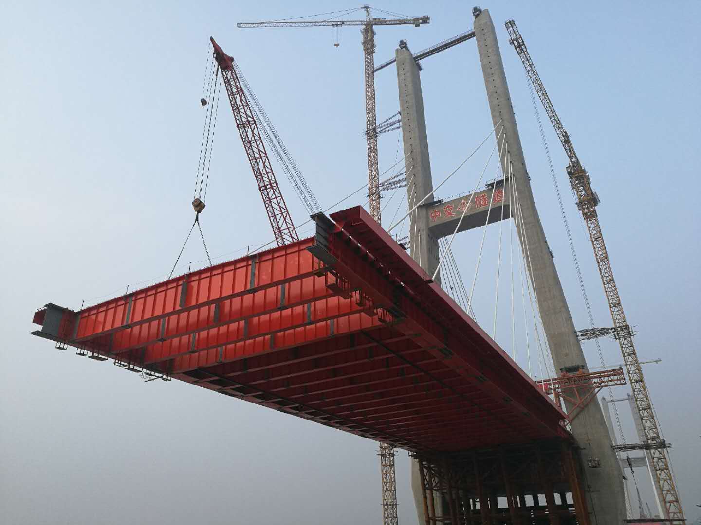 山西側(cè),11號(hào)主塔第8節(jié)段安裝正在有序進(jìn)行中,橫梁已完成吊裝,現(xiàn)進(jìn)行小縱梁穩(wěn)定板安裝和橋面板倒運(yùn)。