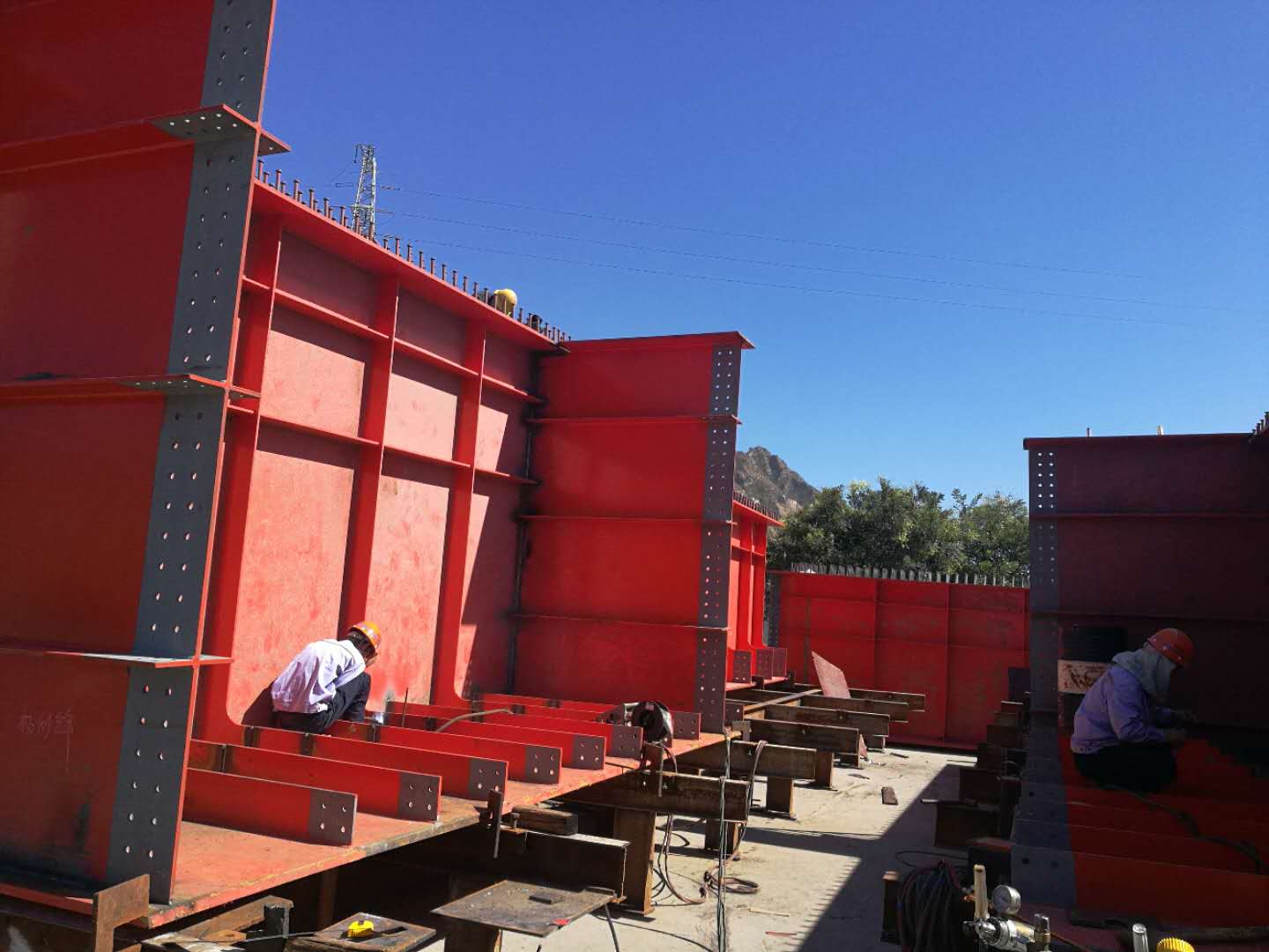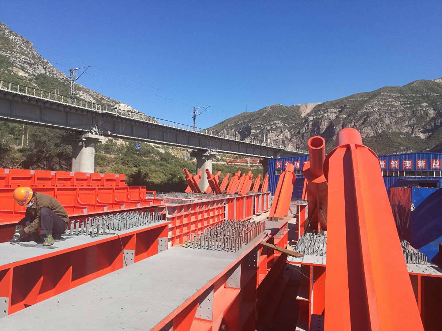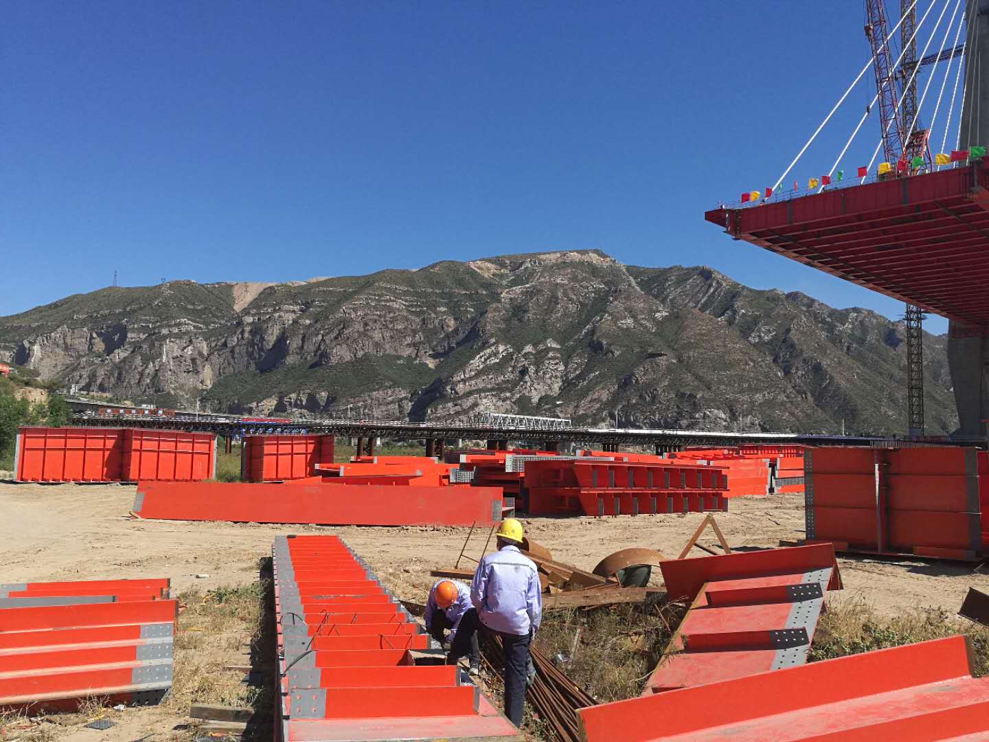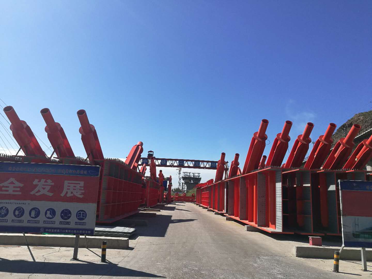陜西側(cè)主梁及錨拉板除了合龍段,已全部到現(xiàn)場,正在進(jìn)行邊跨支架上錨拉板的焊接